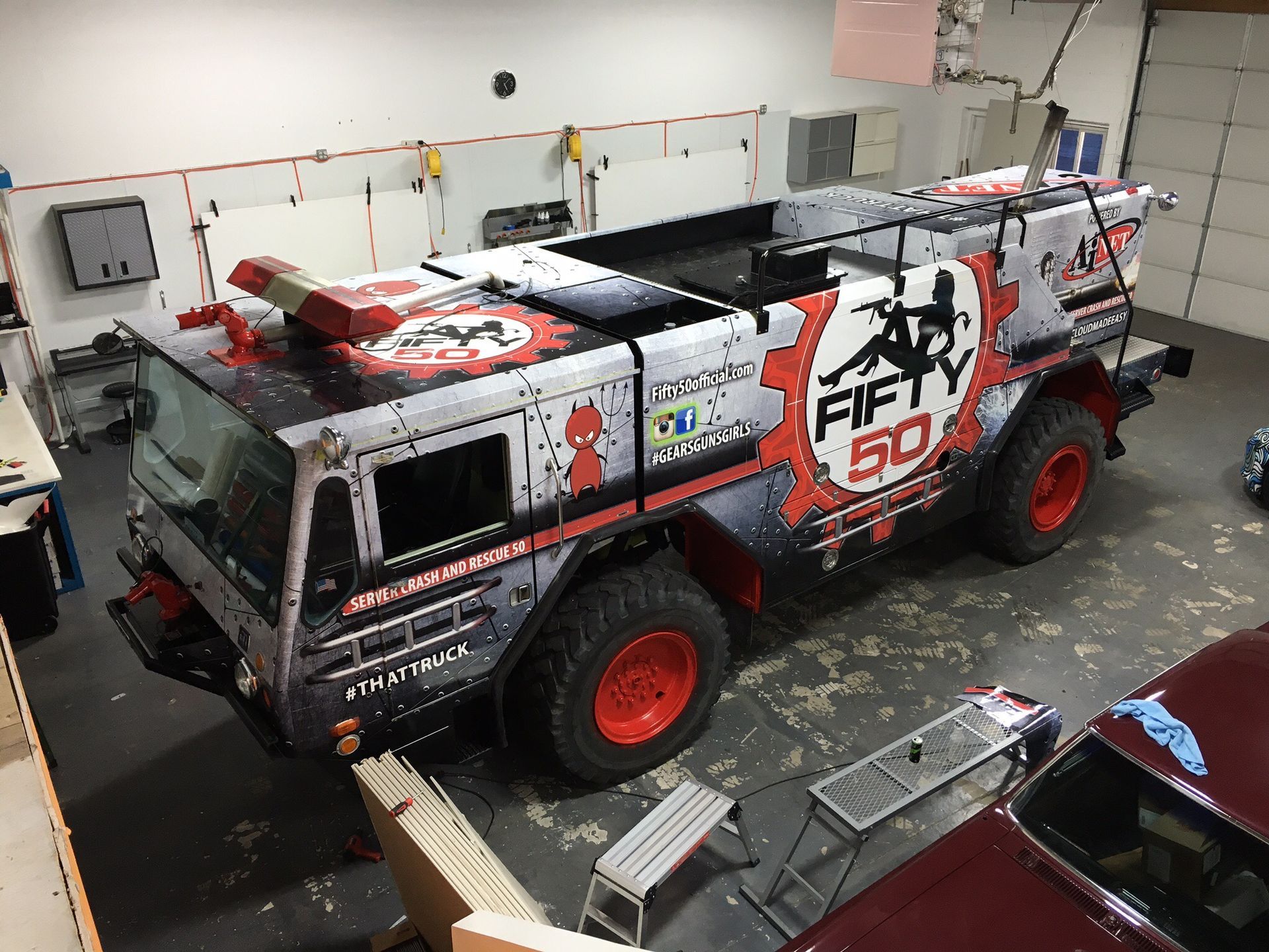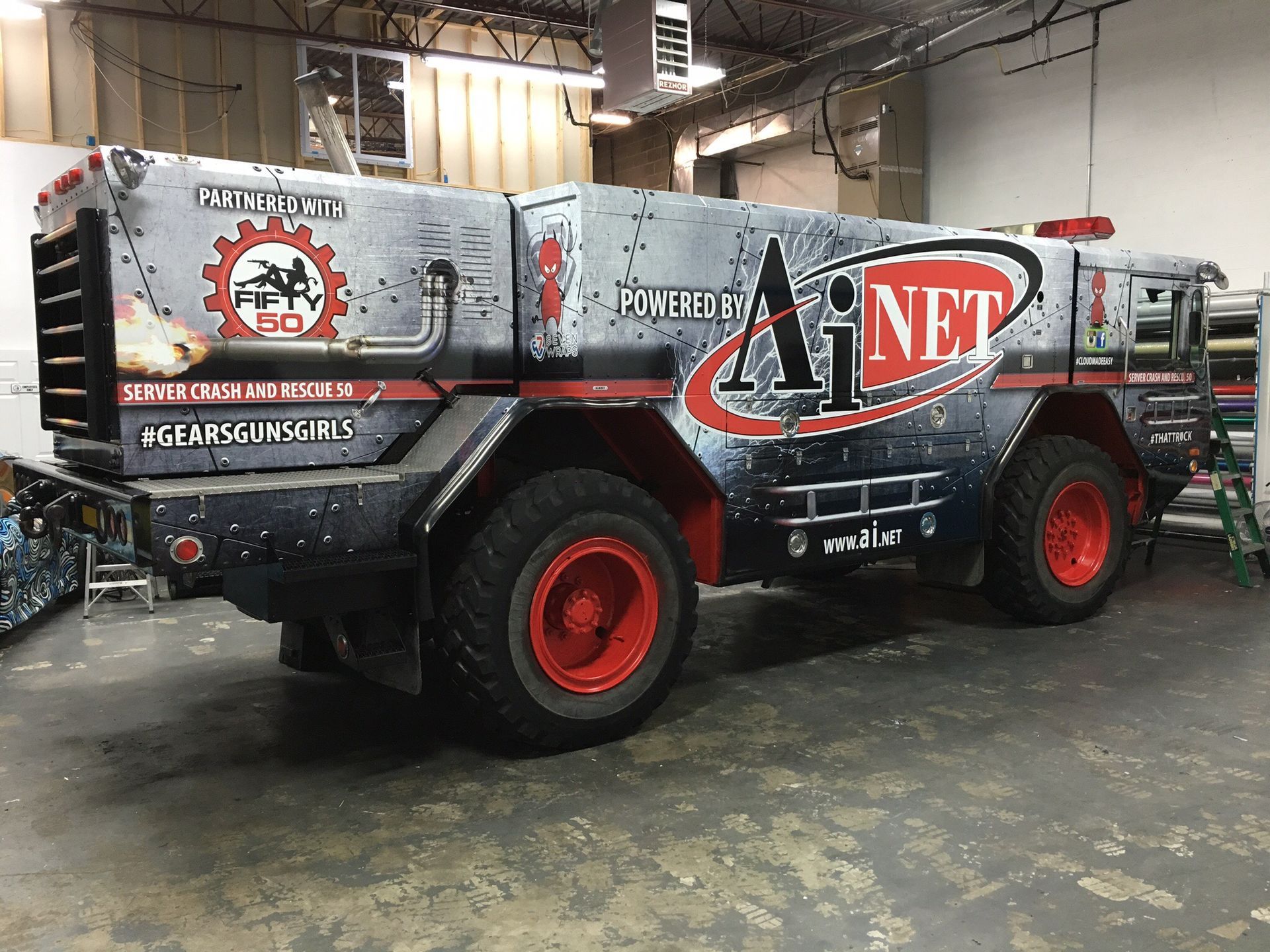 This design is one of my favorite designs still date. This project did start out as a Max Max stlye design creation with a 50/50 wrap. One side is Ai NET and the other is the Fifty 50, showcasing some cool affects with fire, pipes, metal, demanding that this truck gets your hear turning!