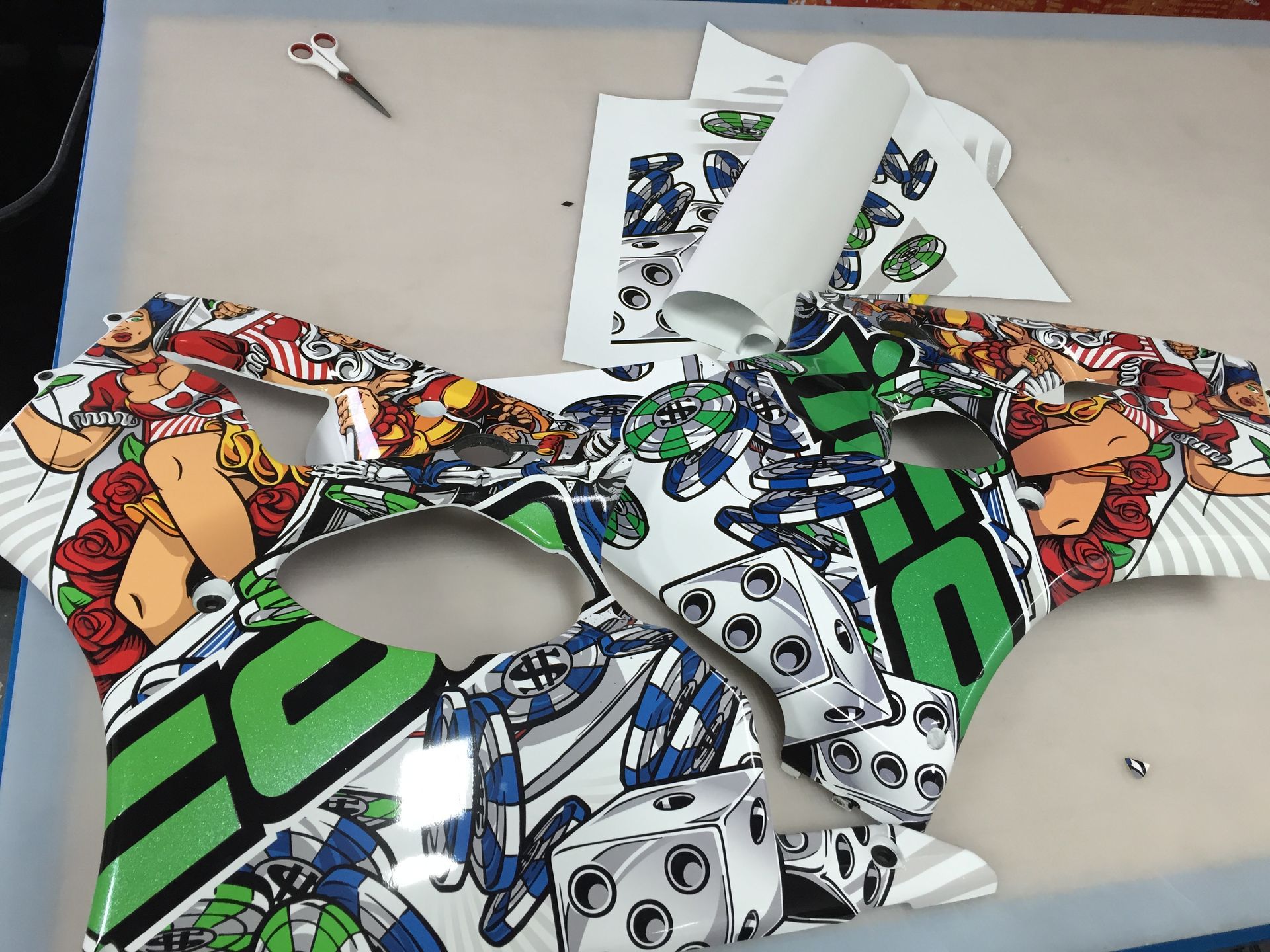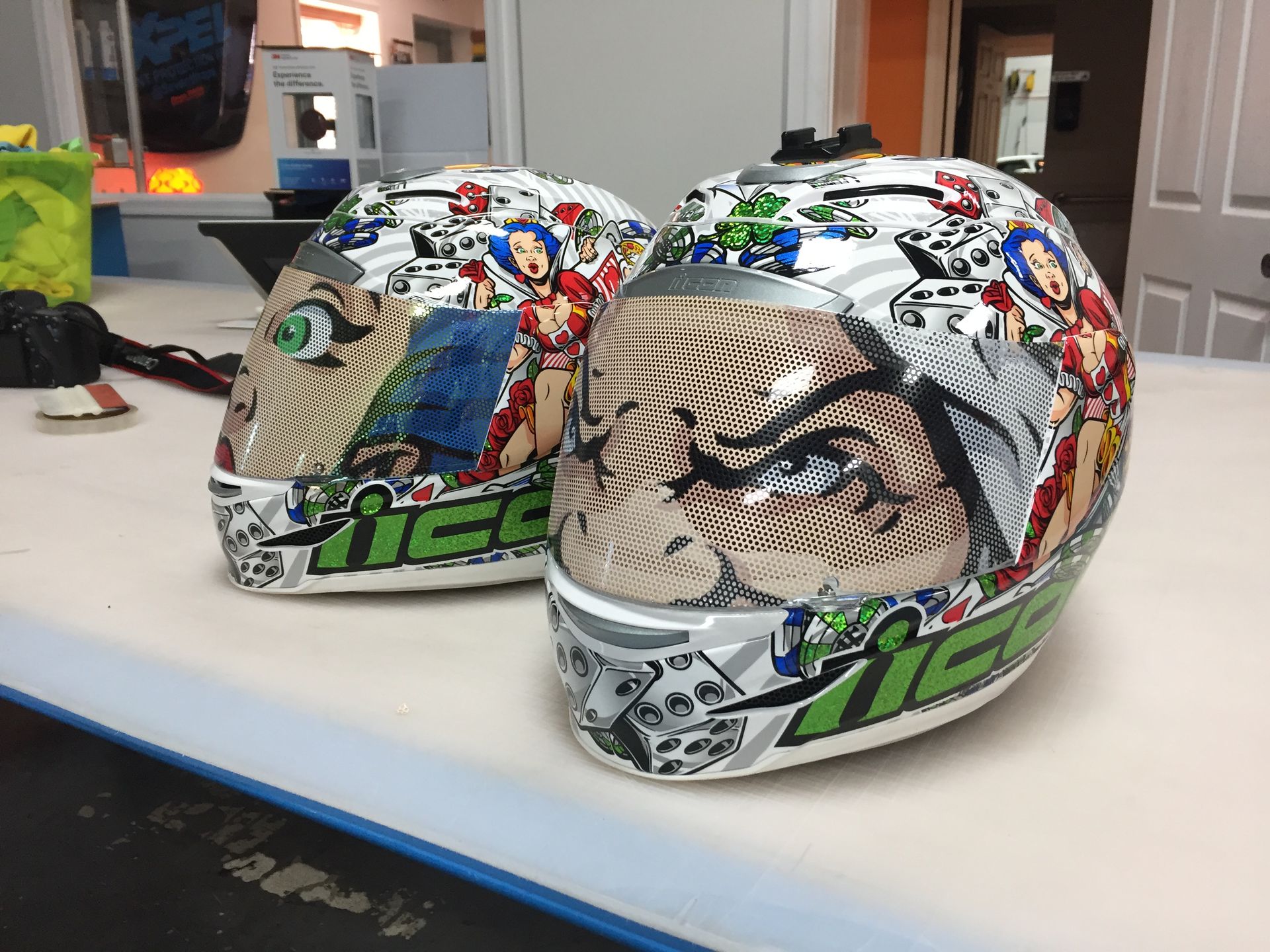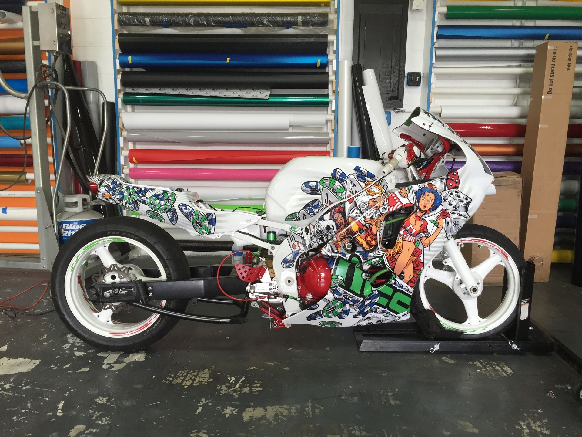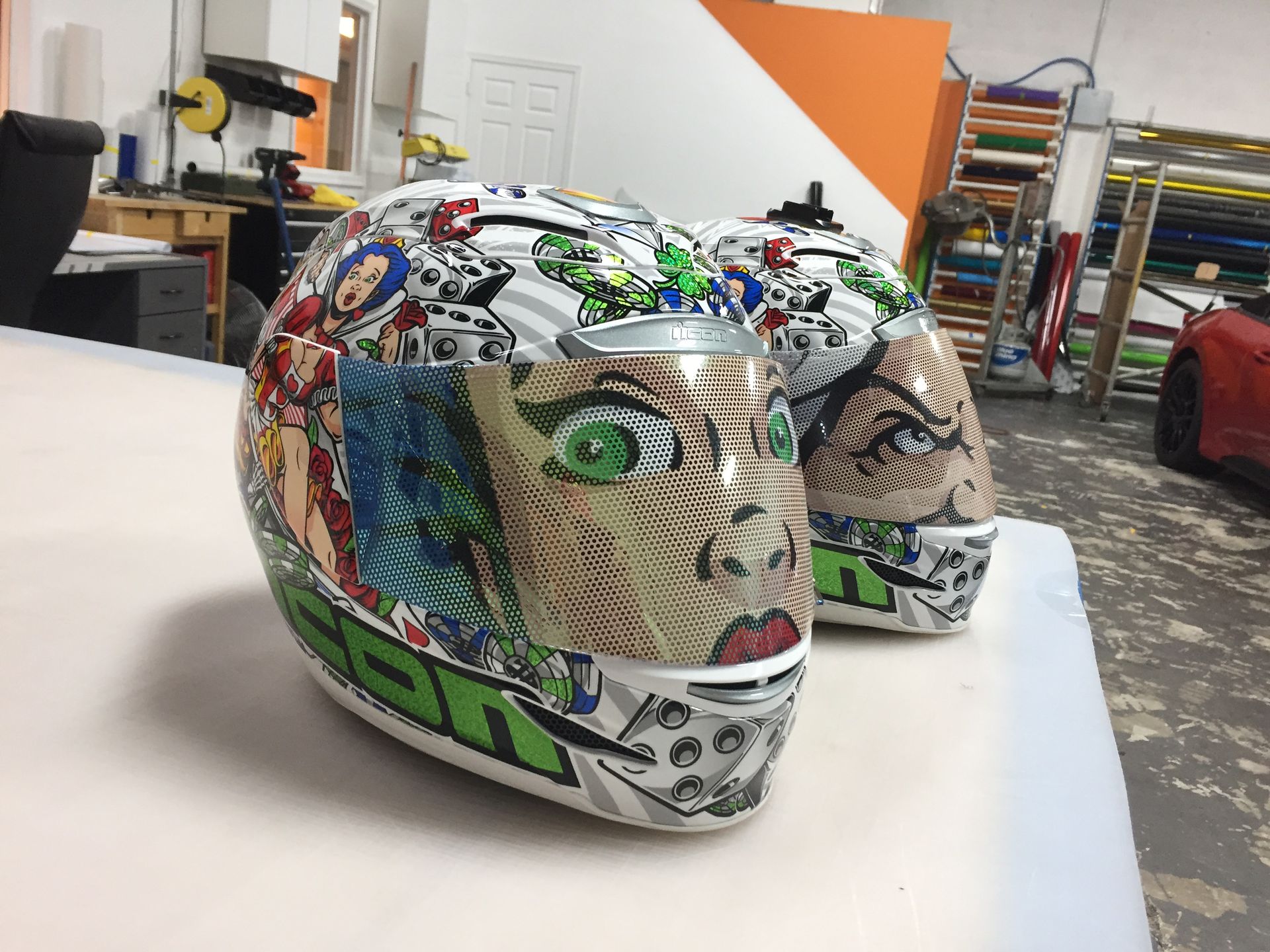 Really cool project that started with an ICON helmet design. We worked on recreating the graphics and separating all the elements to fit the lines on the bike. The frame was wrapped with a duplicate for the fenders so there wasn't an loss when side viewing the wrap. The final touch was to add the faces to the helmets.