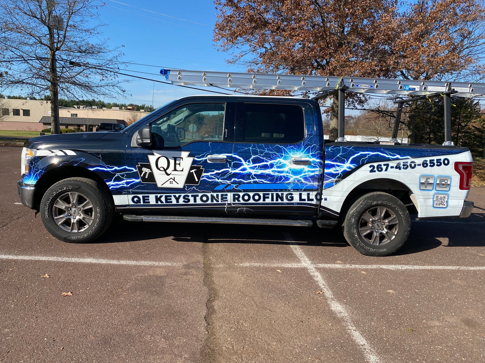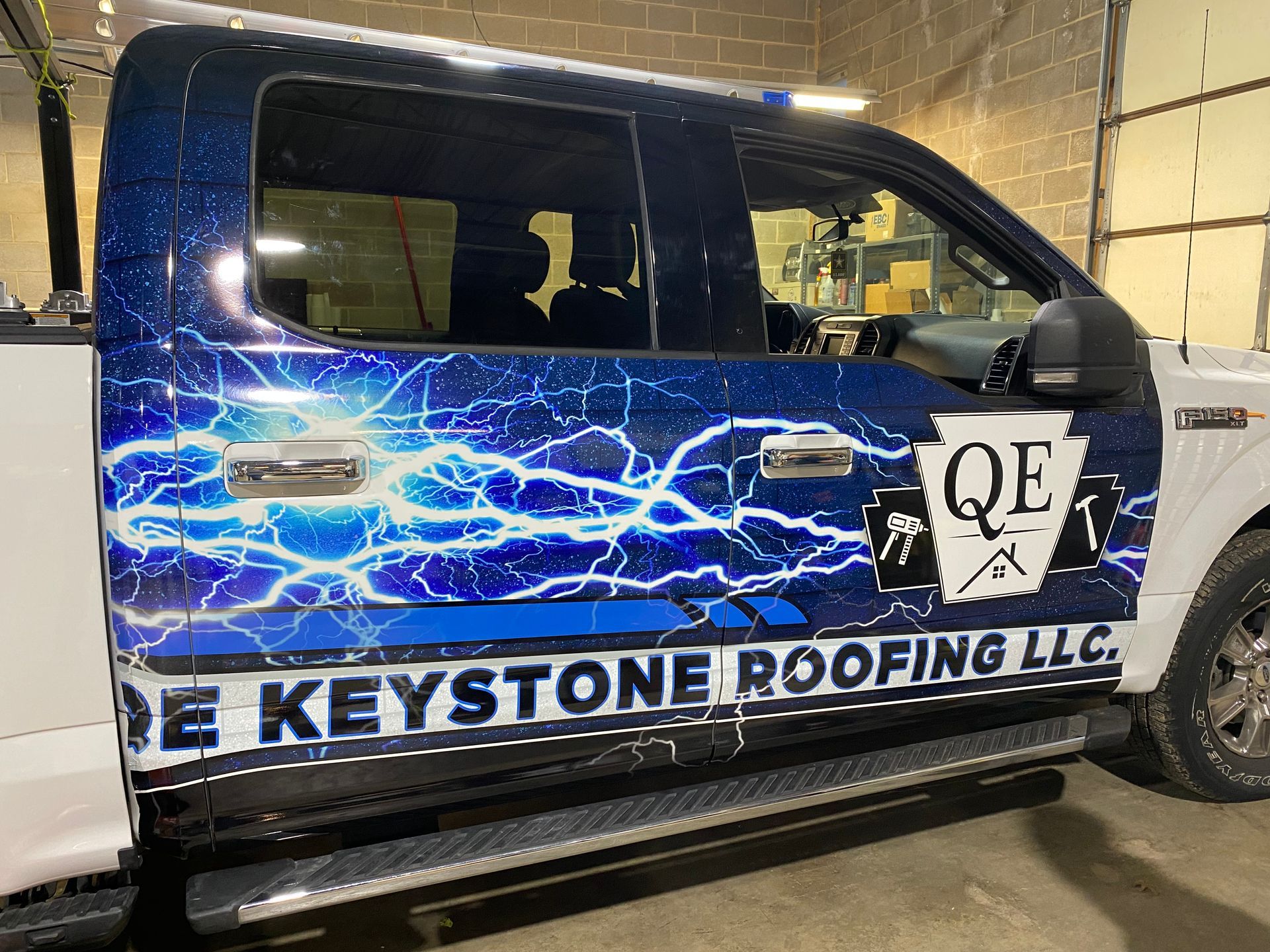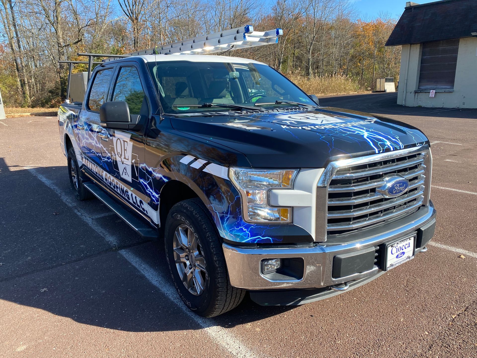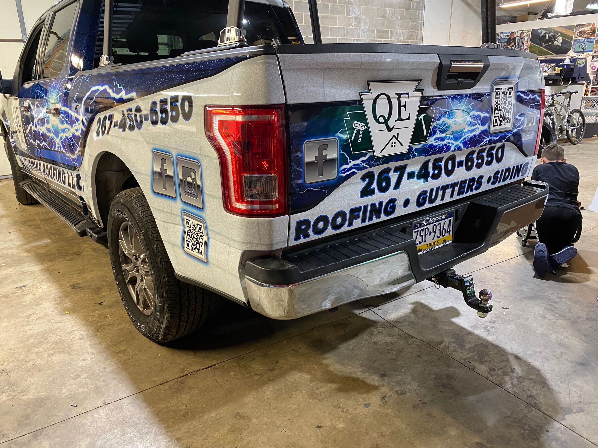 This wrap was based of a business card design they had, of course it got enhanced but the result was electric! We love the subtle roof shingle grains added to the wrap along with the ghosted shingle panels.