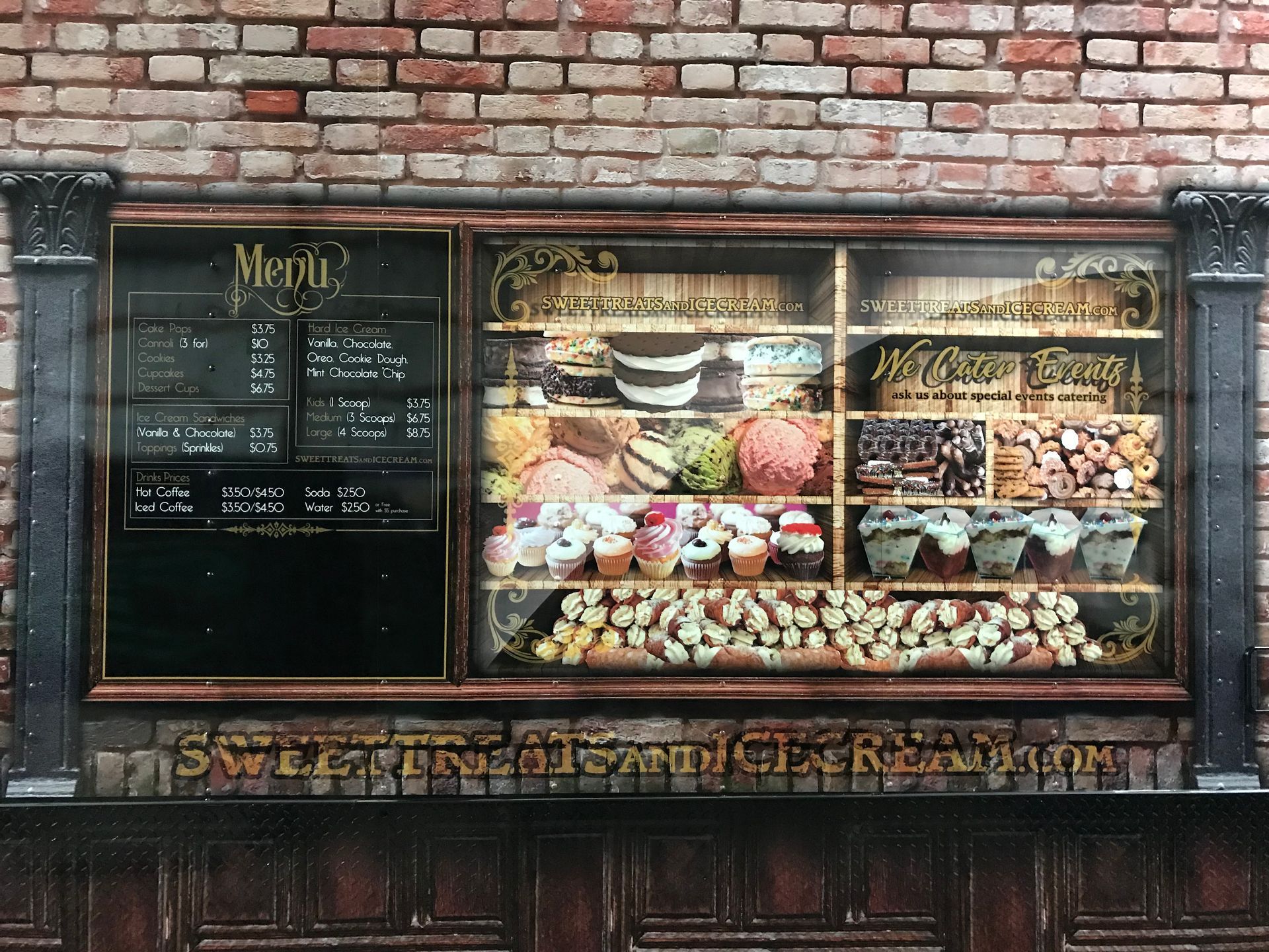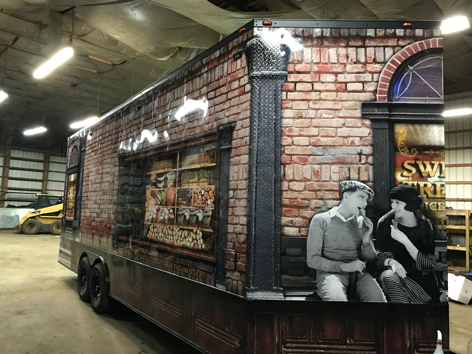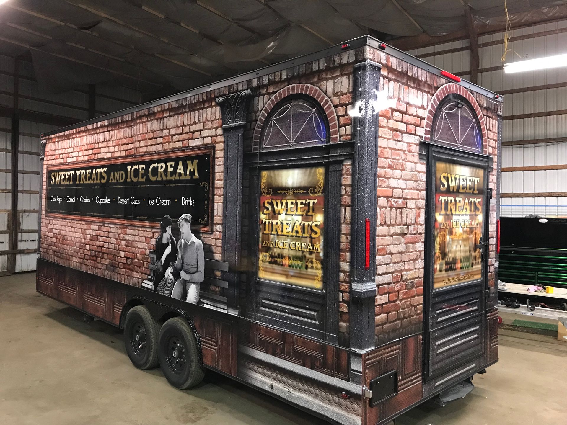For this wrap design the customer wanted that old-school, vintage store front look and feel. Finding and proofing old shop windows along with some gold leaf looking lettering was exactly what it needed. Finding and adding in all the treats to look like they are on display was a challenge and took time but came out GREAT! The old pillars were a great way to separate the sides and the brick just brought it all together!