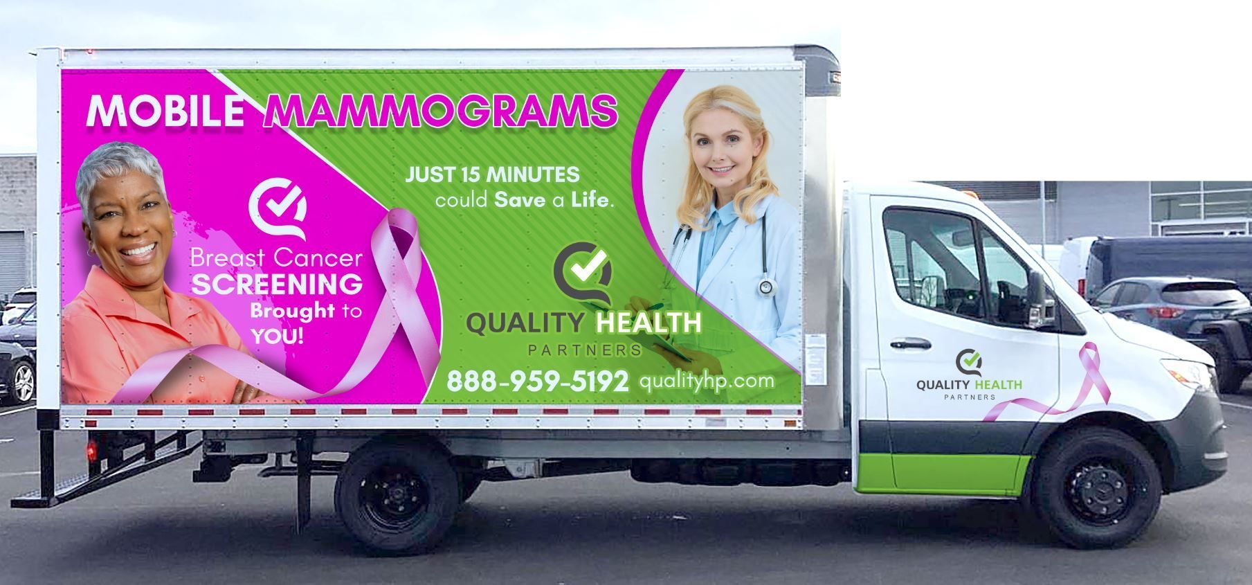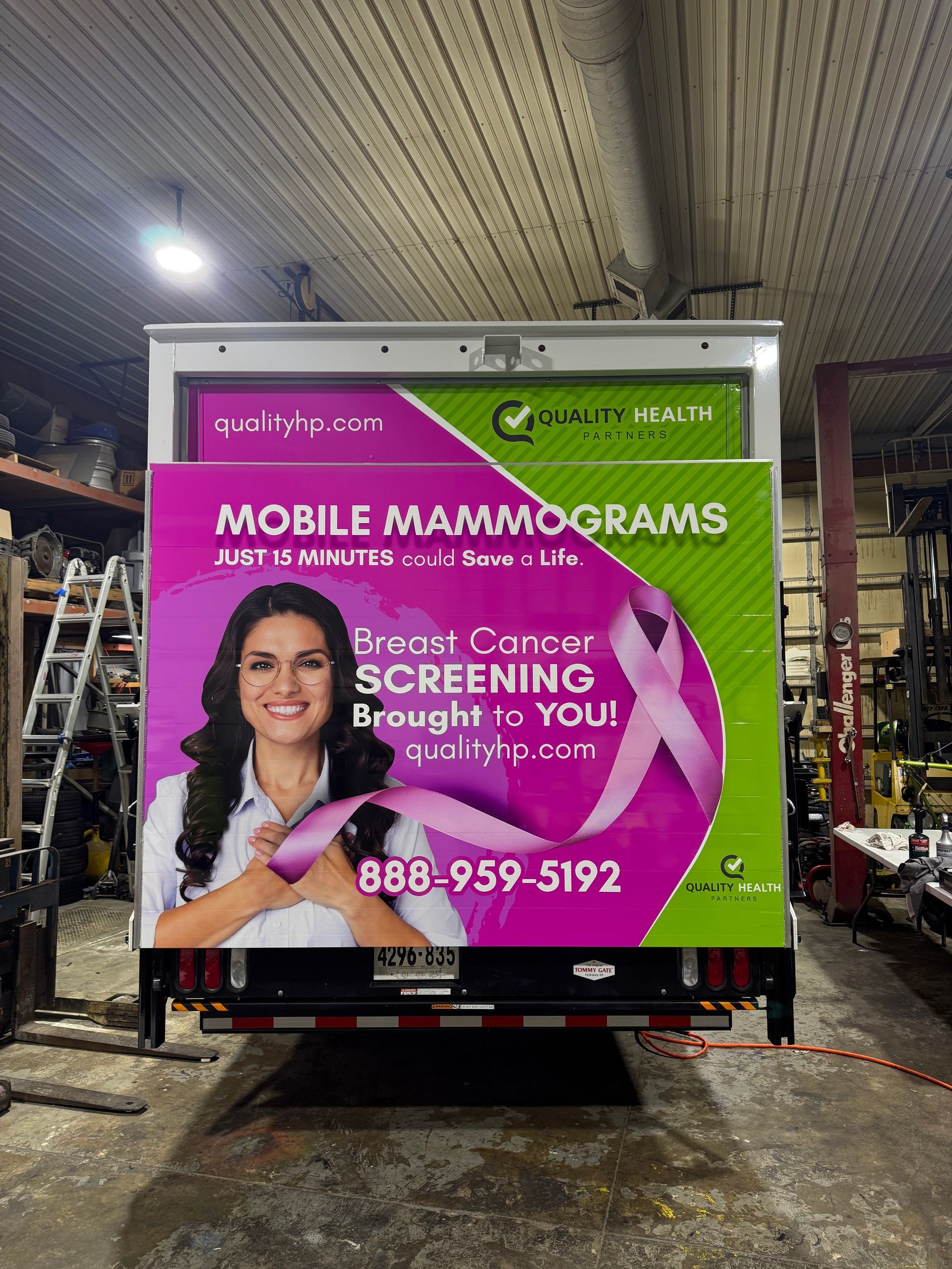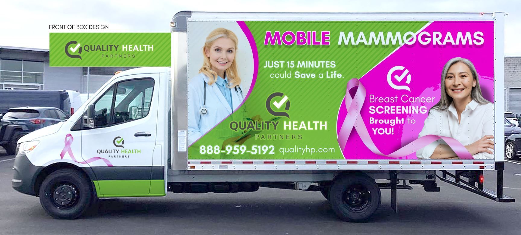 This was a great project and for a great cause. We were asked to create a mobile billboard for a mobile mammogram screening company from Quality Health Partners.